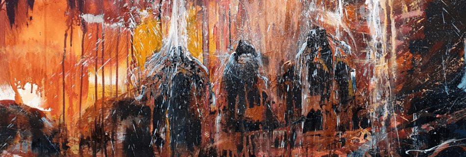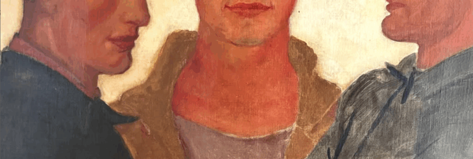 Three Basque sailors stand beneath an oil-soaked sky — youth, command, and shadow sharing one frame. The first glows in burnt yellows and oranges, his sharp gaze alive with defiance. Beside him, a stern officer folds his arms in authority. The third, half in darkness, seems drained of life, his eyes wandering beyond the canvas. …