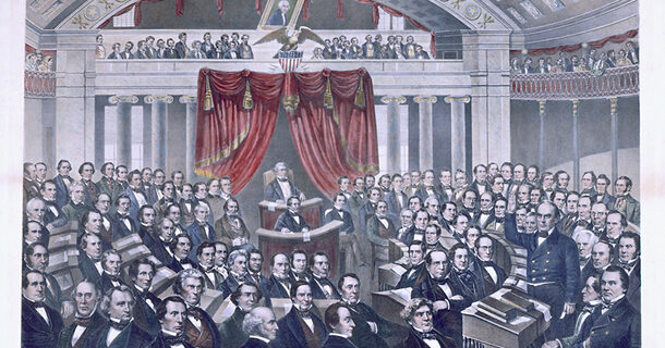 Painted circa 1850, this monumental oil on canvas captures U.S. Senator Daniel Webster delivering his historic “Seventh of March” speech on the Compromise of 1850—one of the most consequential debates in the nation’s history. Attributed to Eliphalet M. Brown, Jr., the work portrays the Senate Chamber in full session, with over one hundred recognizable figures …