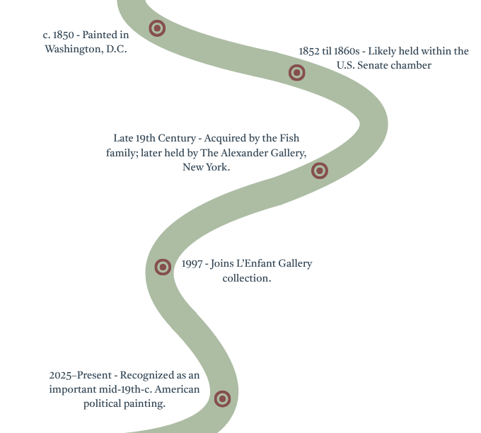 Painted circa 1850, this monumental oil on canvas captures U.S. Senator Daniel Webster delivering his historic “Seventh of March” speech on the Compromise of 1850—one of the most consequential debates in the nation’s history. Attributed to Eliphalet M. Brown, Jr., the work portrays the Senate Chamber in full session, with over one hundred recognizable figures including Henry Clay, Stephen A. Douglas, Jefferson Davis, and John C. Calhoun. Rendered with remarkable precision and narrative clarity, it remains the finest known visual record of mid-nineteenth-century American legislative life. Beyond its artistic achievement, the painting embodies the moral and political turbulence of its era; unity versus division, principle versus compromise. Its influence extends into the twentieth century, having inspired President John F. Kennedy’s admiration for Webster, as later recalled by Senator Ted Kennedy. Today, it is both a work of art and a living document of the nation’s conscience.