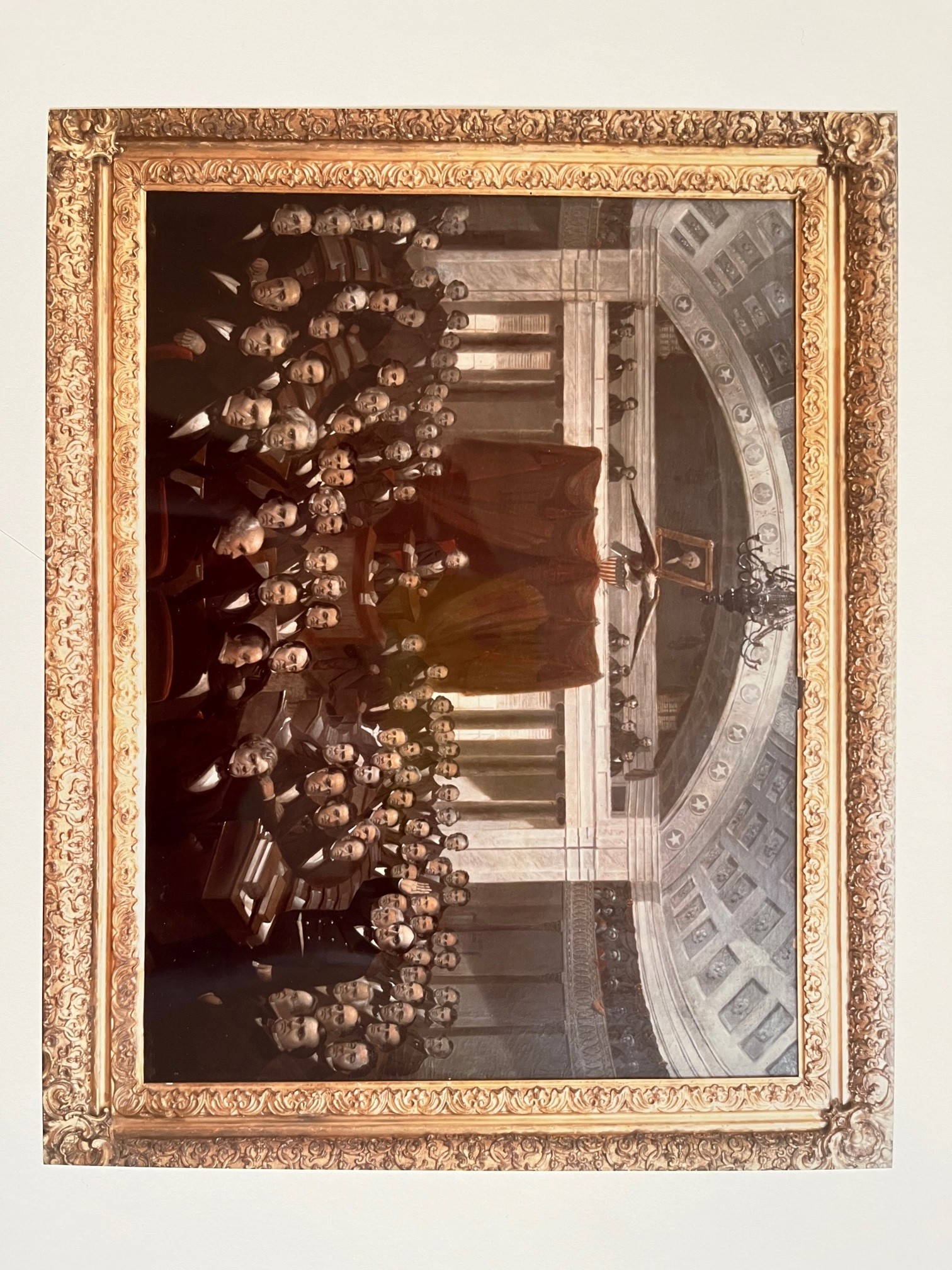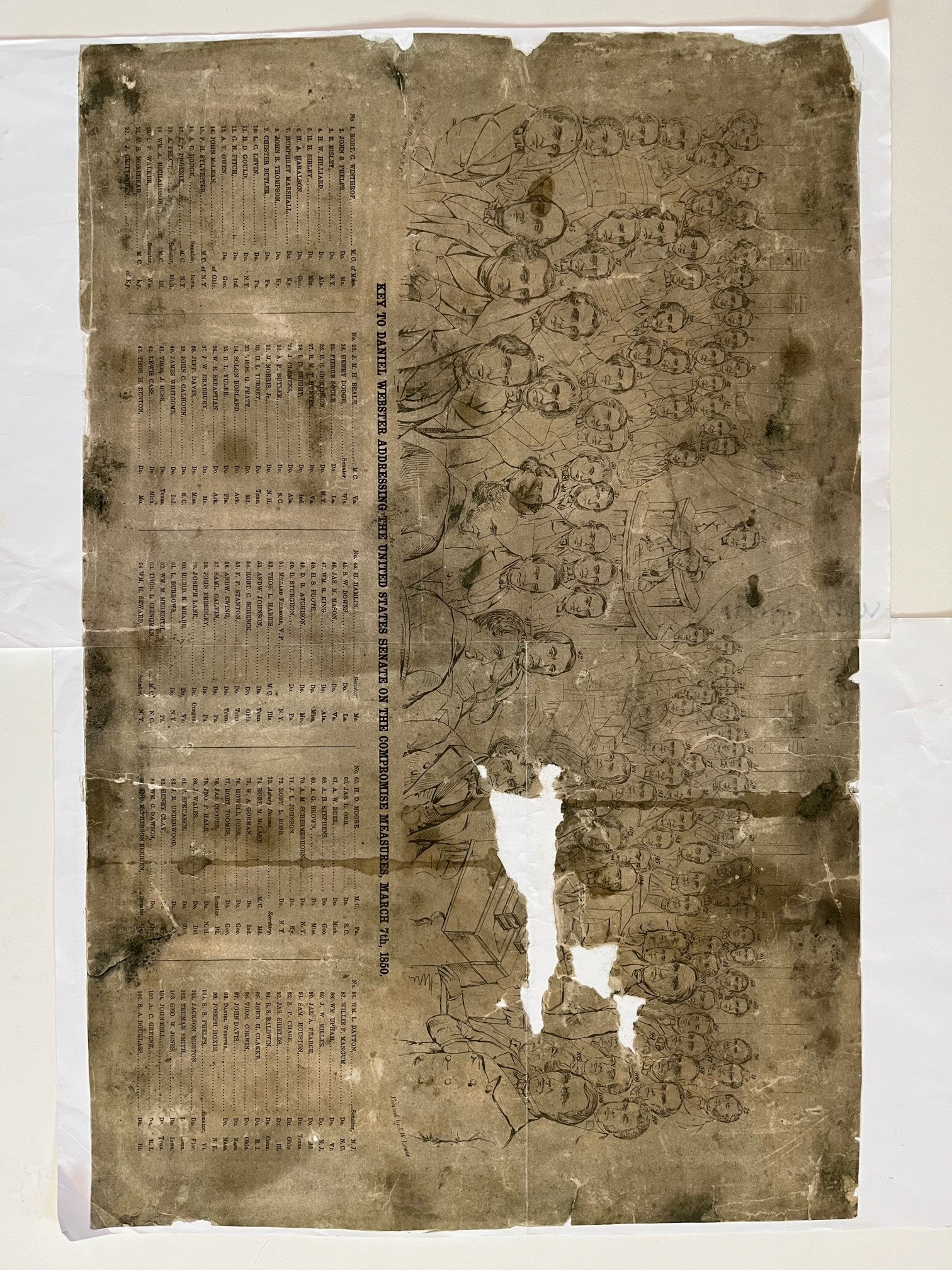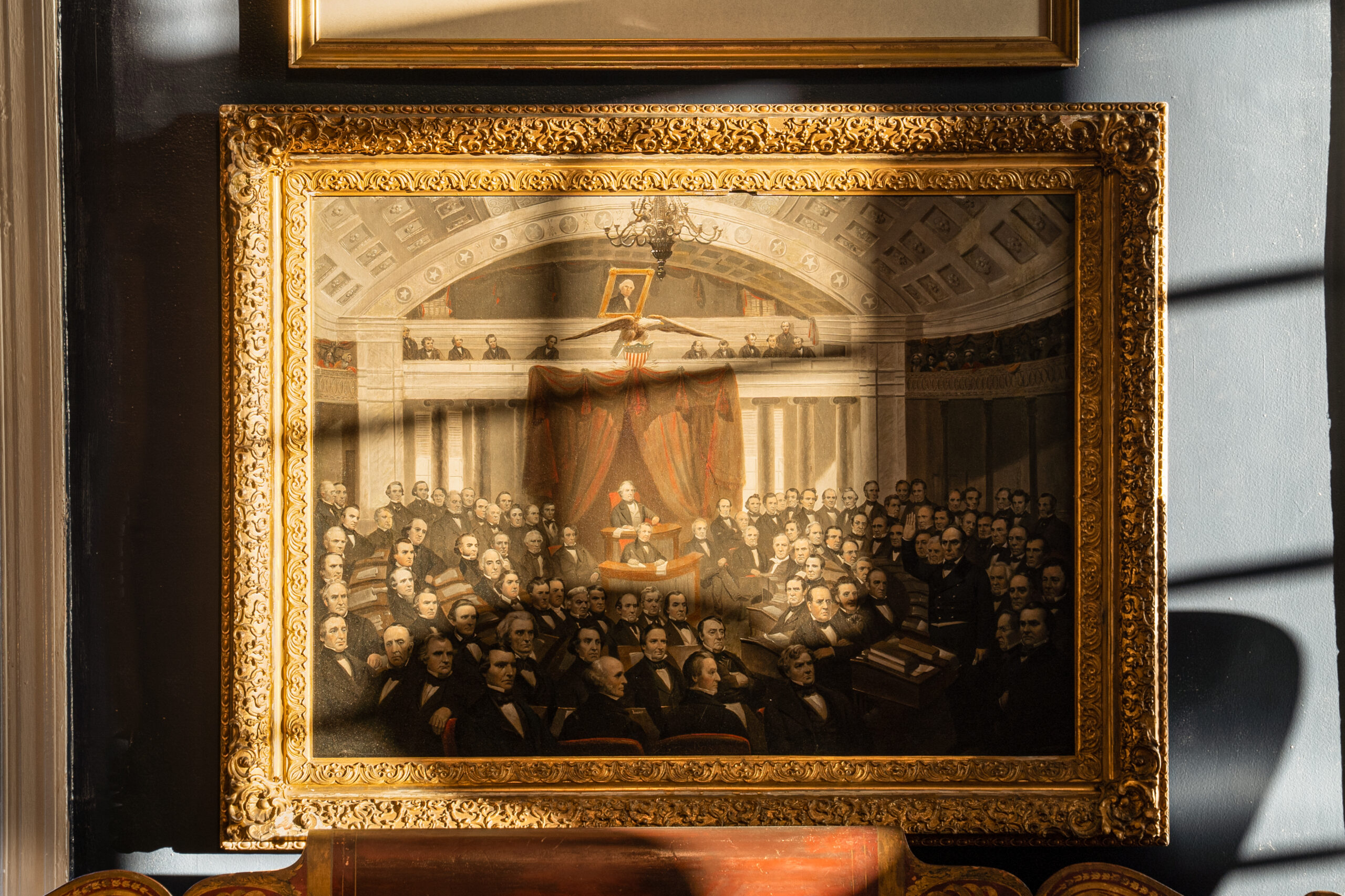 Painted circa 1850, this monumental oil on canvas captures U.S. Senator Daniel Webster delivering his historic “Seventh of March” speech on the Compromise of 1850—one of the most consequential debates in the nation’s history. Attributed to Eliphalet M. Brown, Jr., the work portrays the Senate Chamber in full session, with over one hundred recognizable figures including Henry Clay, Stephen A. Douglas, Jefferson Davis, and John C. Calhoun. Rendered with remarkable precision and narrative clarity, it remains the finest known visual record of mid-nineteenth-century American legislative life. Beyond its artistic achievement, the painting embodies the moral and political turbulence of its era: unity versus division, principle versus compromise. Its influence extends into the twentieth century, having inspired President John F. Kennedy’s admiration for Webster, as later recalled by Senator Ted Kennedy. Today, it stands as both a work of art and a living document of the nation’s conscience.