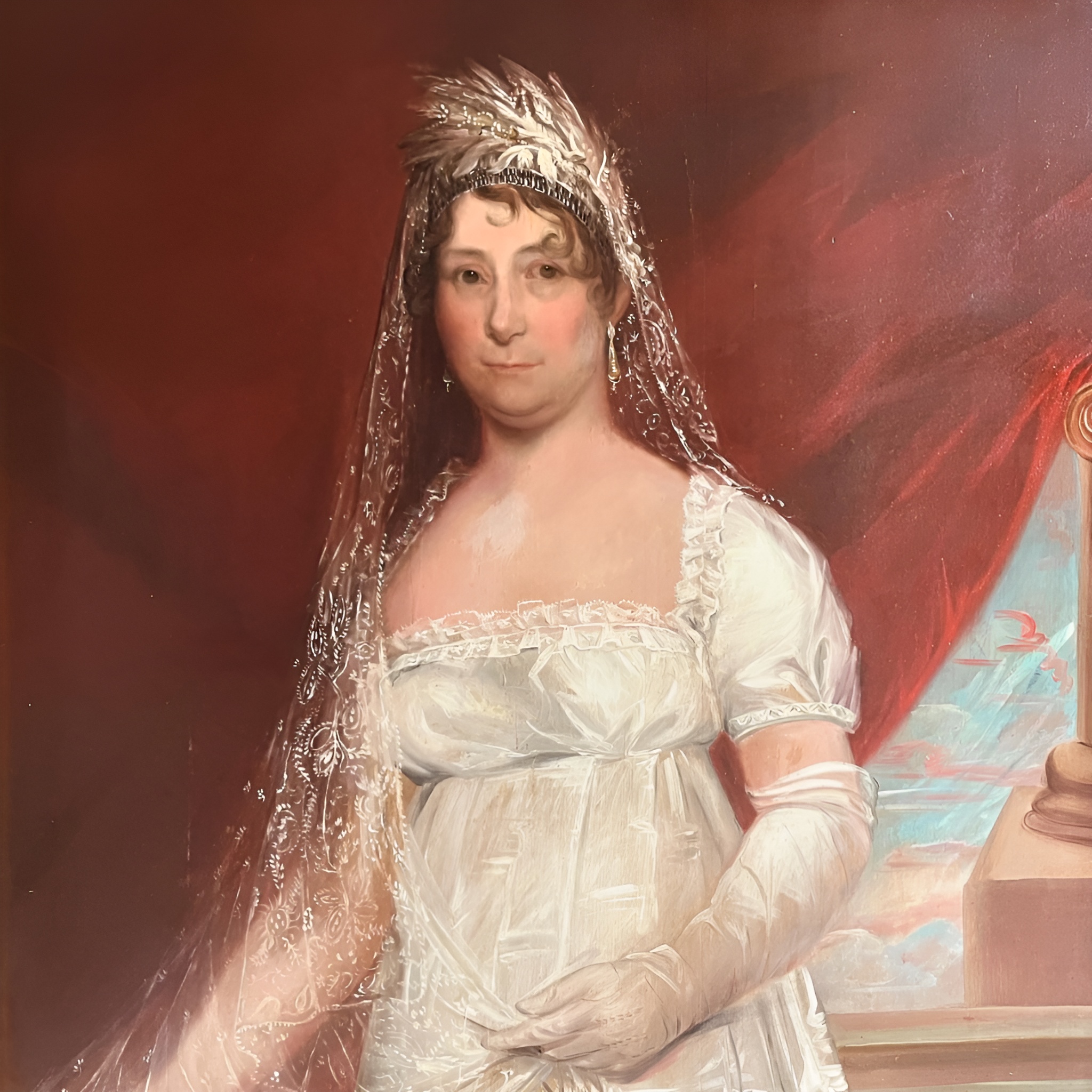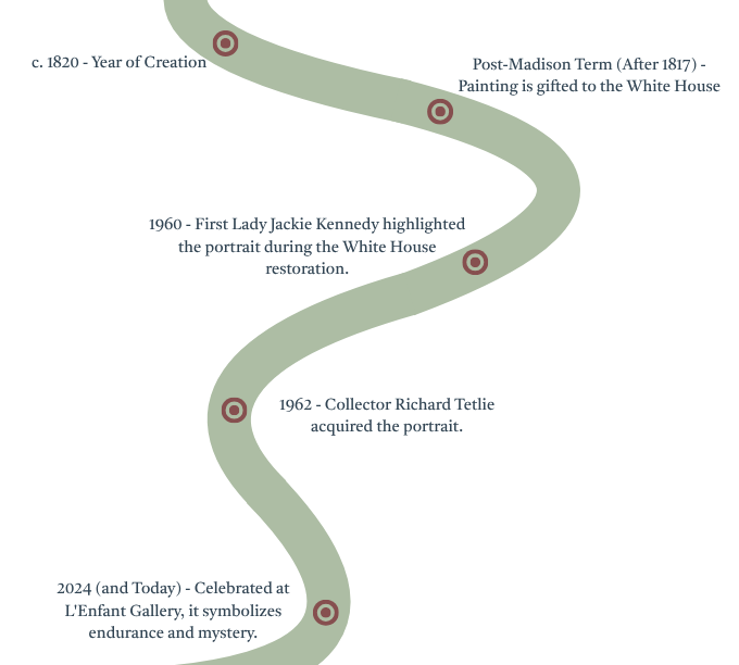 This unsigned oil portrait of Dolley Madison, attributed to John Wesley Jarvis, captures not just the likeness of America’s fourth First Lady, but the resilience and elegance that defined her legacy. Painted circa 1820, the work’s soft lighting and rich tonal palette project Madison’s quiet strength, her composure framed in gold leaf grandeur. The portrait’s journey mirrors the life of its subject: praised, exiled, rediscovered. Once admired as a national treasure, it was later removed from the White House after its authenticity was disputed, only to resurface decades later through the hands of art collector Richard Tetlie. Today, she watches over visitors from the walls of L’Enfant Gallery - a symbol of endurance, identity, and the enduring mystery of America’s cultural memory.