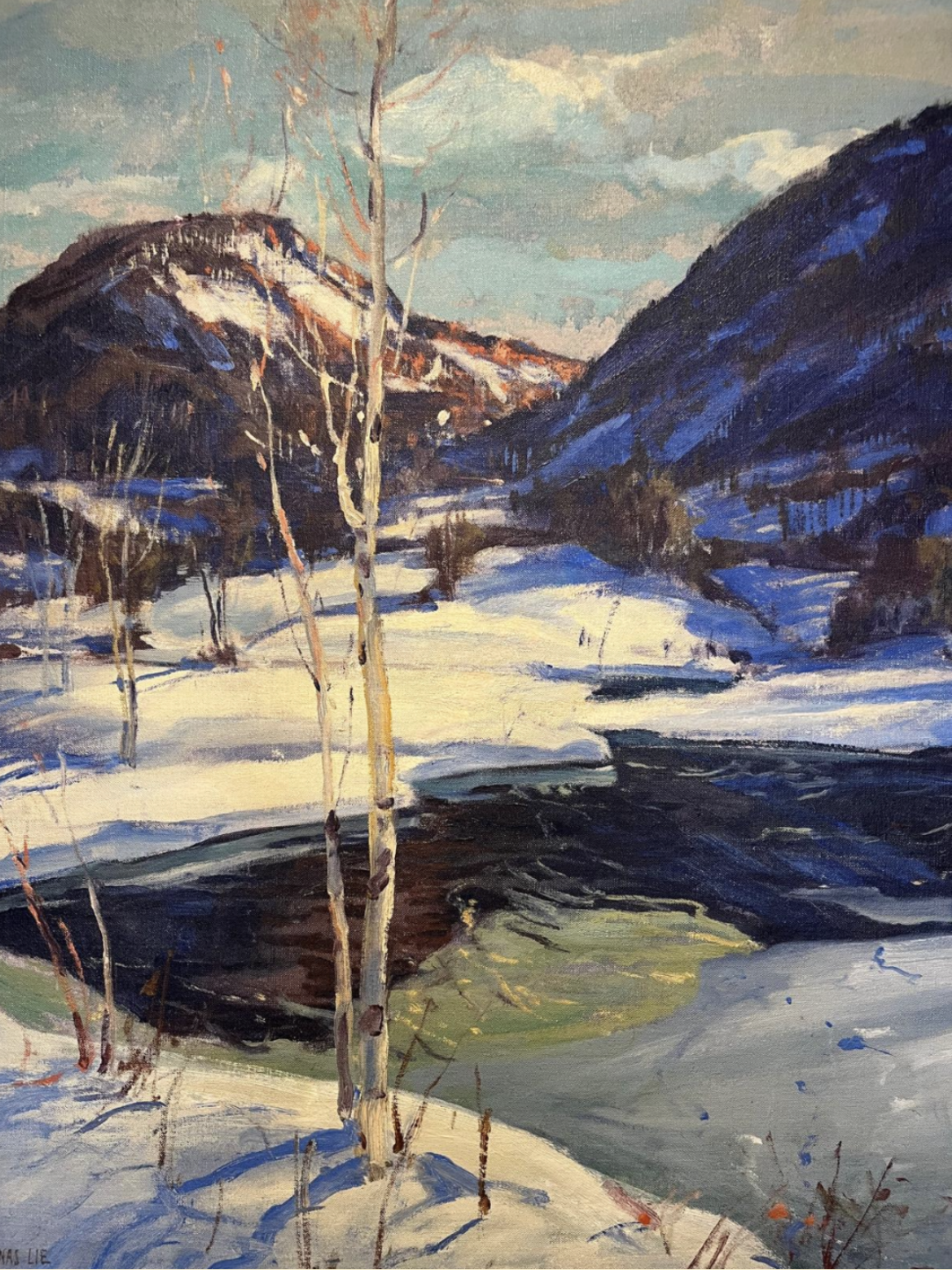 A luminous winter landscape, First Thaw captures the fleeting moment when snow yields to sunlight, and whispers of spring stir beneath their frozen blanket. Jonas Lie renders the transition with a musician’s rhythm and a philosopher’s calm, transforming paint into melody. The composition’s harmony of blues, whites, and ochres evokes the thaw of both nature and spirit—each brushstroke alive with motion and clarity. Originally from the Severance Milliken Estate in Cleveland, First Thaw traveled to Richard Love Galleries for the 1996 exhibition American Winter Scenes of Yesteryear before appearing in the landmark 2006 retrospective of Lie’s work at Spanierman Gallery, New York. The painting bridges the artist’s Norwegian heritage and his American identity, offering a vision of renewal that reflects Lie’s lifelong dialogue between memory, place, and emotion.