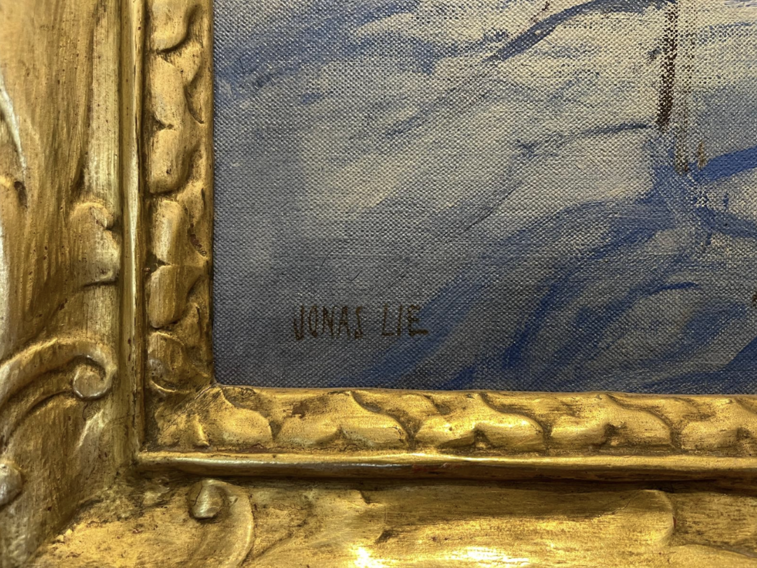 Lie’s oils display richly layered pigment and vibrant tonality, built through successive glazes that produce depth and luminosity. His winter scenes often exhibit delicate impasto in the snow’s highlights and finely preserved craquelure consistent with early twentieth-century materials. The canvas surfaces remain stable, reflecting the artist’s careful preparation and the enduring vitality of his palette.