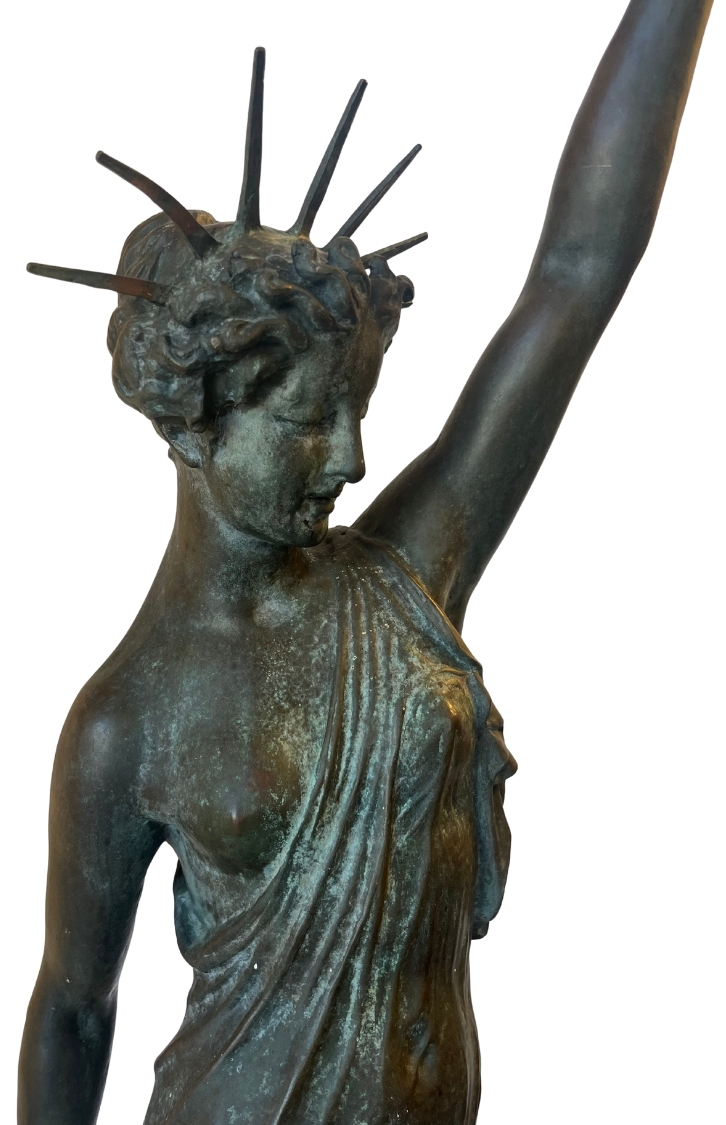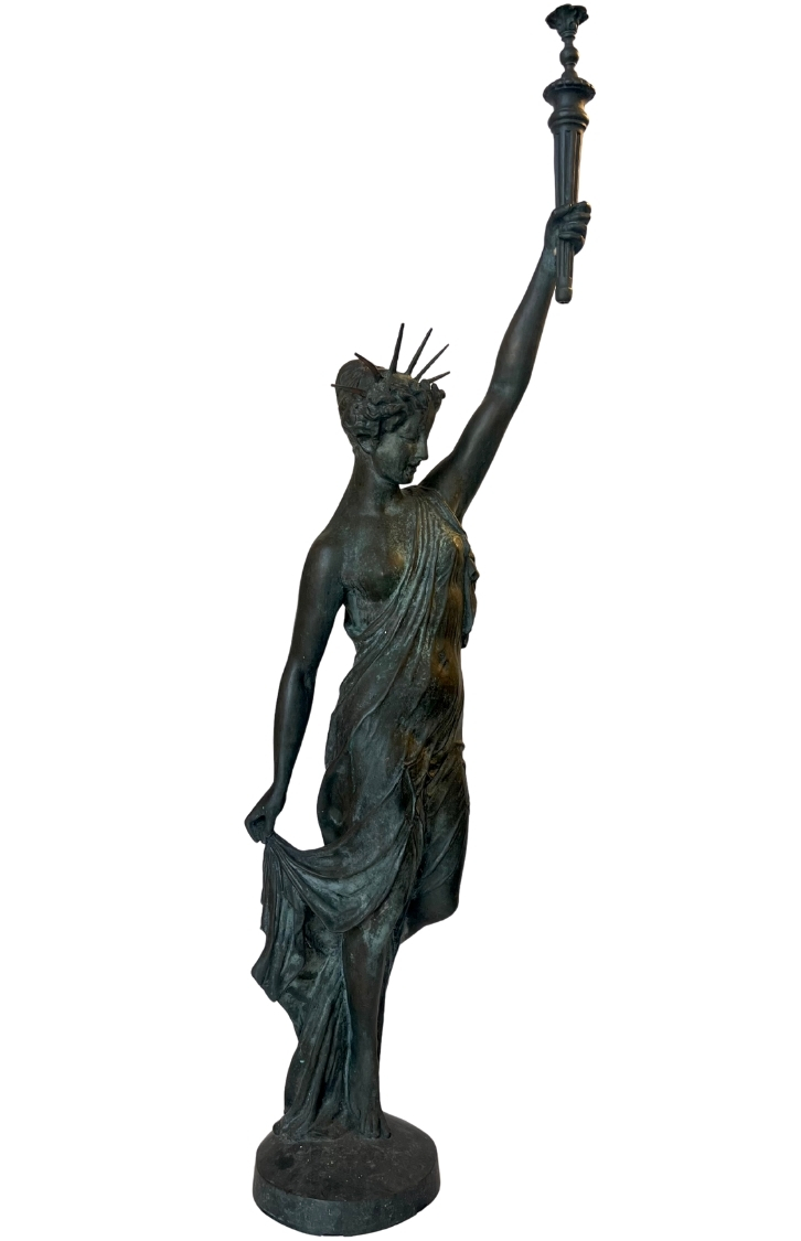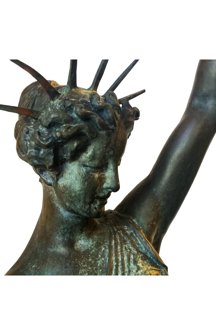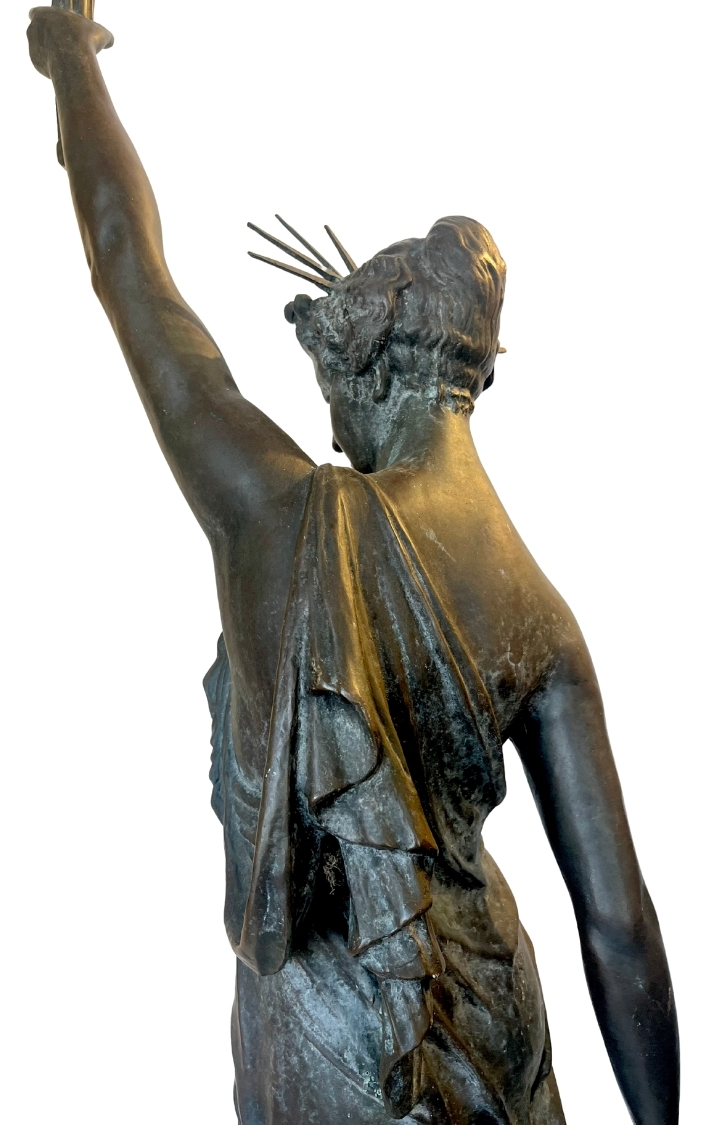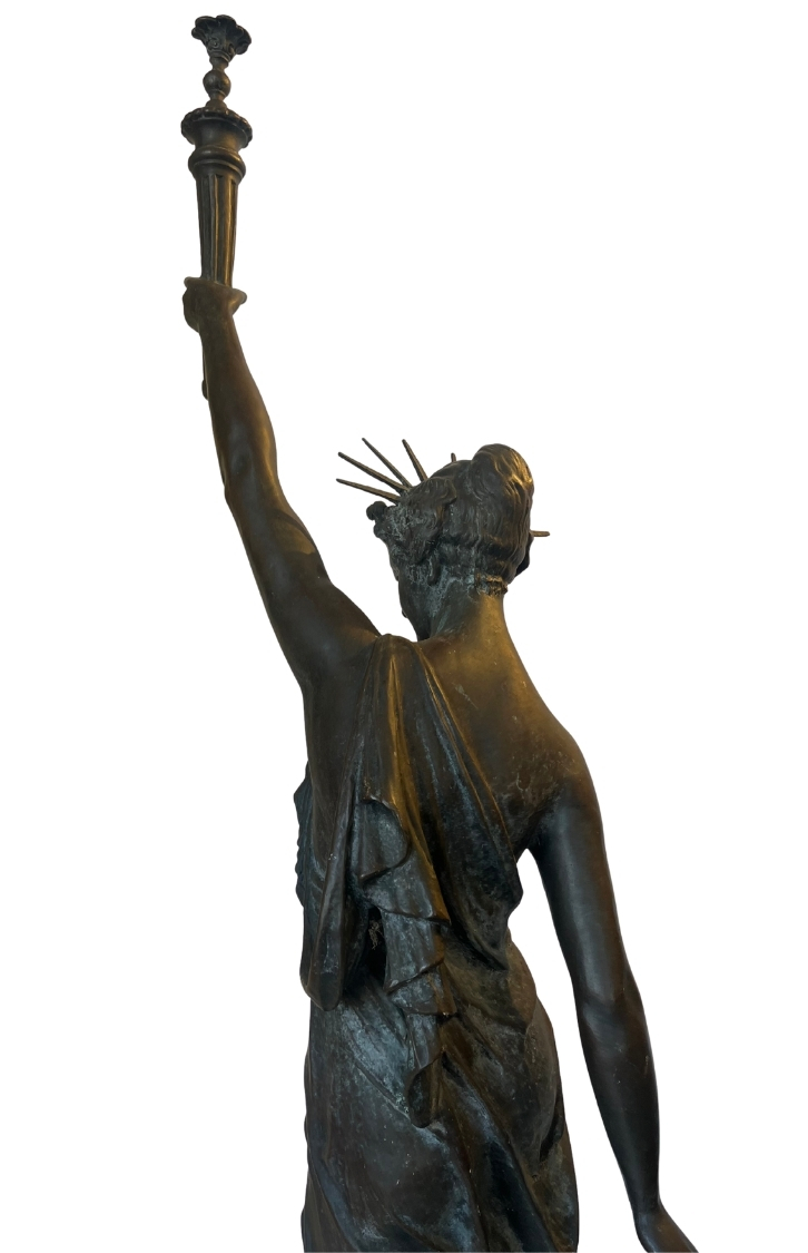 This piece, titled Small Bronze Sculpture of Stature of Liberty, is by Frederic Auguste Bartholdi and dates to Cast in 1873; Dedicated 1876, reflecting a Historical style. It is executed in Bronze, showcasing the use of materials and technique. The dimensions and framing details are not specified, leaving its scale open to interpretation. The work is signed by the artist. Works in the historical tradition often emphasize technique and thematic expression, inviting viewers to engage with the subject and context. This summary is generated from catalog records and reviewed for accuracy in attribution, date, and materials. Its style and material qualities reflect the cultural context of the period, demonstrating craftsmanship and thematic depth.